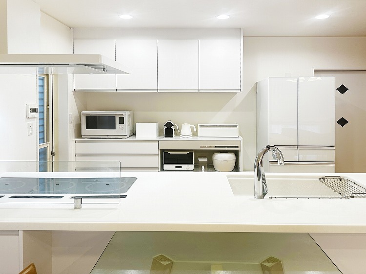 調理家電スペースやコンセントの位置、照明の配置に至るまで、細部に配慮が行き届いており、キッチンに立つたびに満足感を得られる設計となっています。