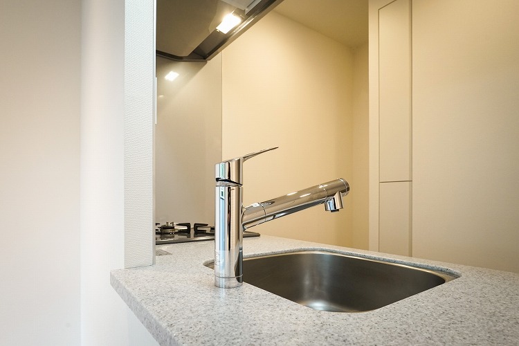 キッチンの天板やシンクには、掃除のしやすい素材が使われており、日常的な手入れが楽です。