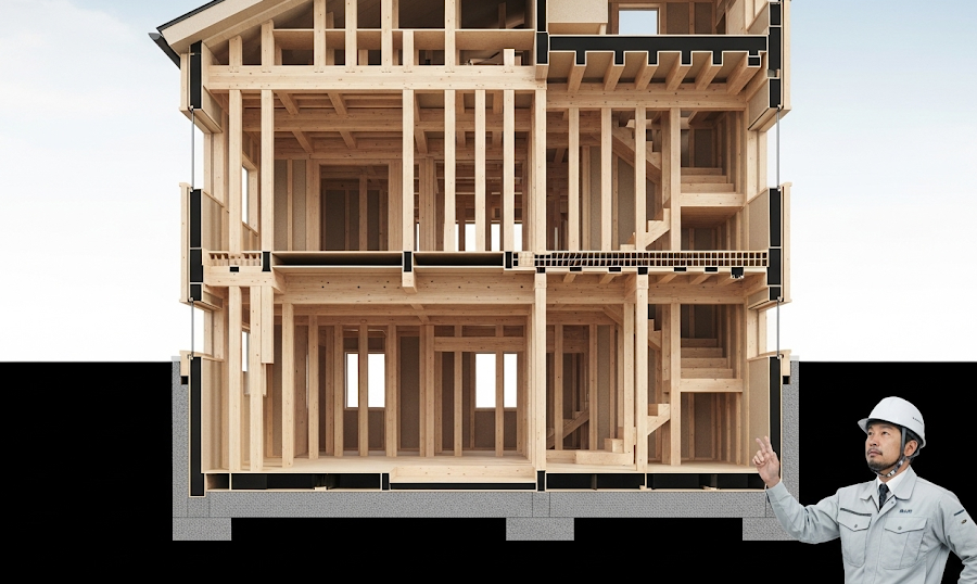 柱や梁で骨格を組み、さらに構造用耐力面材で壁を一体化させることで、地震の揺れを建物全体で受け止め、力を分散させることができます。