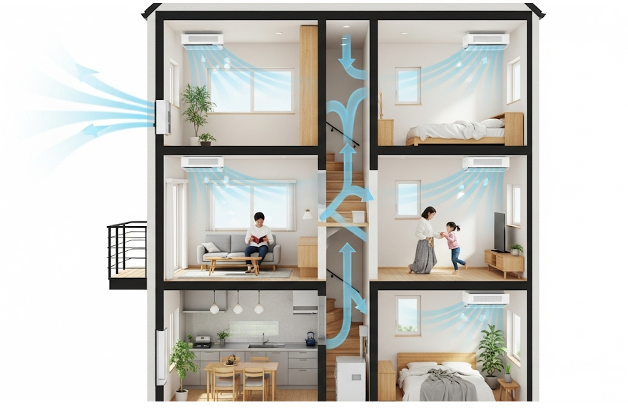 桧家住宅の代名詞ともいえる全館空調システム「Z空調」ですが、「3階建てのような複雑な構造にも本当のところ対応しているのか」と疑問に思う方もいるでしょう。