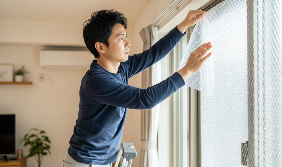- 断熱シートを貼る:ホームセンターなどで手に入る窓用の断熱シート(プチプチのような気泡シートなど)を貼るのも簡単で効果的です。特に冬場の結露対策にもなり、一石二鳥です。透明なタイプを選べば、採光を妨げることもありません。