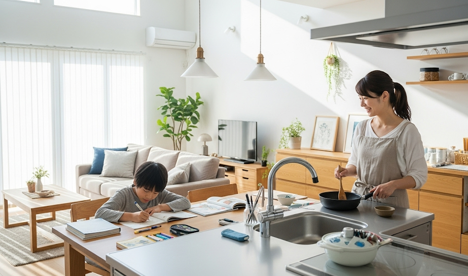 リビング学習を促し、親子のコミュニケーションを深め、豊富な収納でLDKをすっきりと保つ手助けをしてくれます。