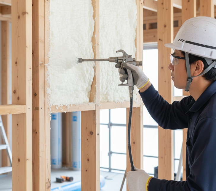 この工法により、柱や配管周りといった複雑な形状の部分にも断熱材が隙間なく密着し、従来のマット状の断熱材では生じやすかった隙間をほとんどなくすことができます。