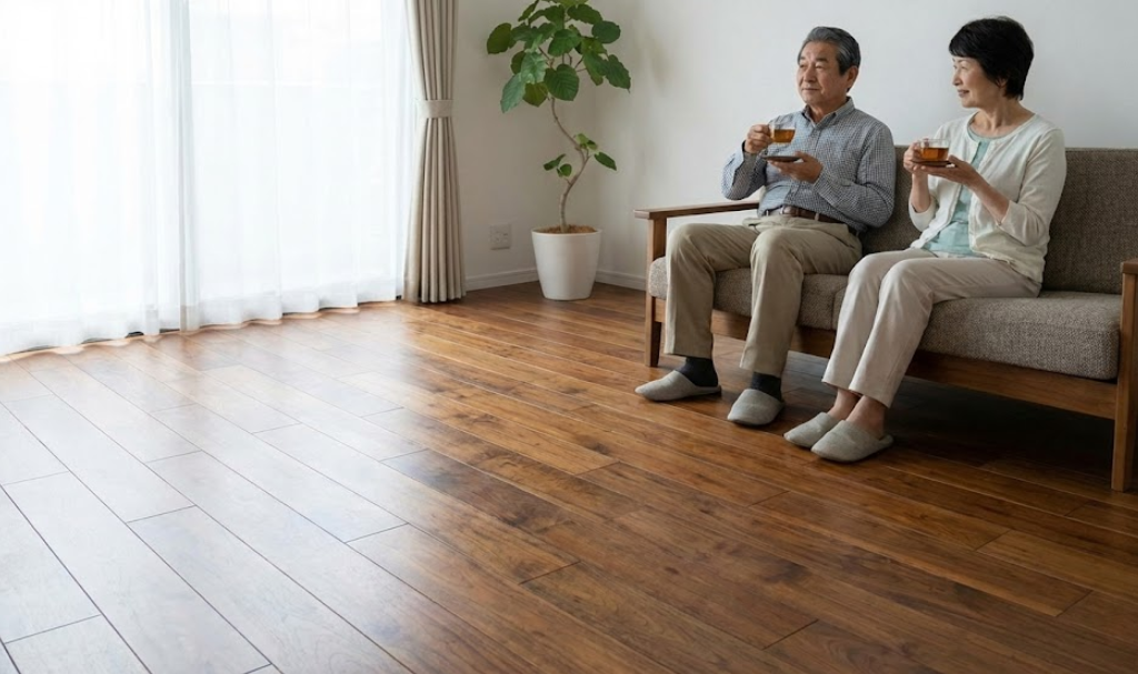 この時期になると、表面の剥がれや摩耗、目地の広がり、歩くとキシキシと音が鳴る「床鳴り」などの症状が現れることがあります。