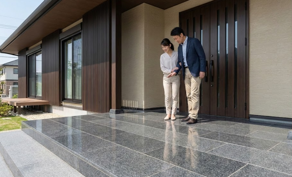 一条工務店の玄関ポーチにおける最大の魅力の一つは、標準仕様で天然の御影石を選択できる点にあります。