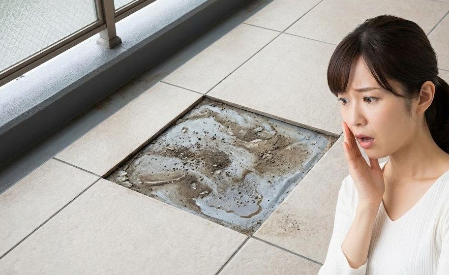 掃除をせずに長期間放置すると、タイルの隙間から落ちた土埃や枯葉、髪の毛などが裏側に堆積し、ヘドロ状の汚れとなって排水の流れを妨げます。